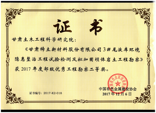 1.獲2017中國有色金屬建設(shè)協(xié)會部級優(yōu)秀工程勘察二等獎;